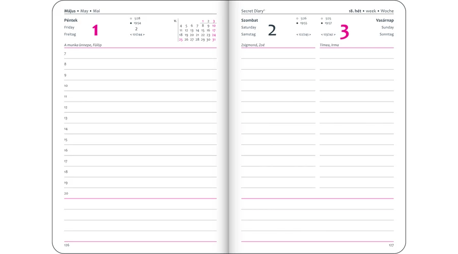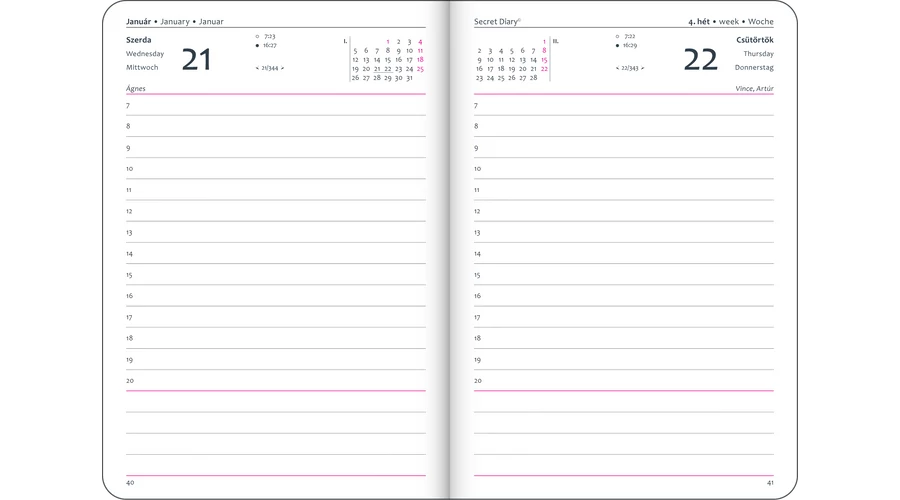 | Tartalom | összesített naptár, havi előjegyzési naptár, névnapjegyzék, nemzetközi ünnepek, telefonregiszter, jegyzetlapok |
